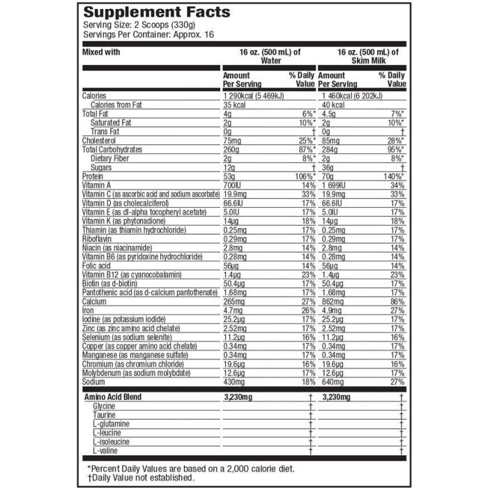 100% Premium Mass Gainer vám pomôže splniť vaše kalorické potreby tým, že poskytuje masívnych 1270 kalórií, vrátane 50 gramov vysoko kvalitného proteínu a 261 gramov sacharidov na poskytnutie energie v každej porcii. Je vybavený dôležitými vitamínmi, minerálmi, kompletným spektrom aminokyselín, ktoré napomáhajú pri budovaní svalovej hmoty a sily.