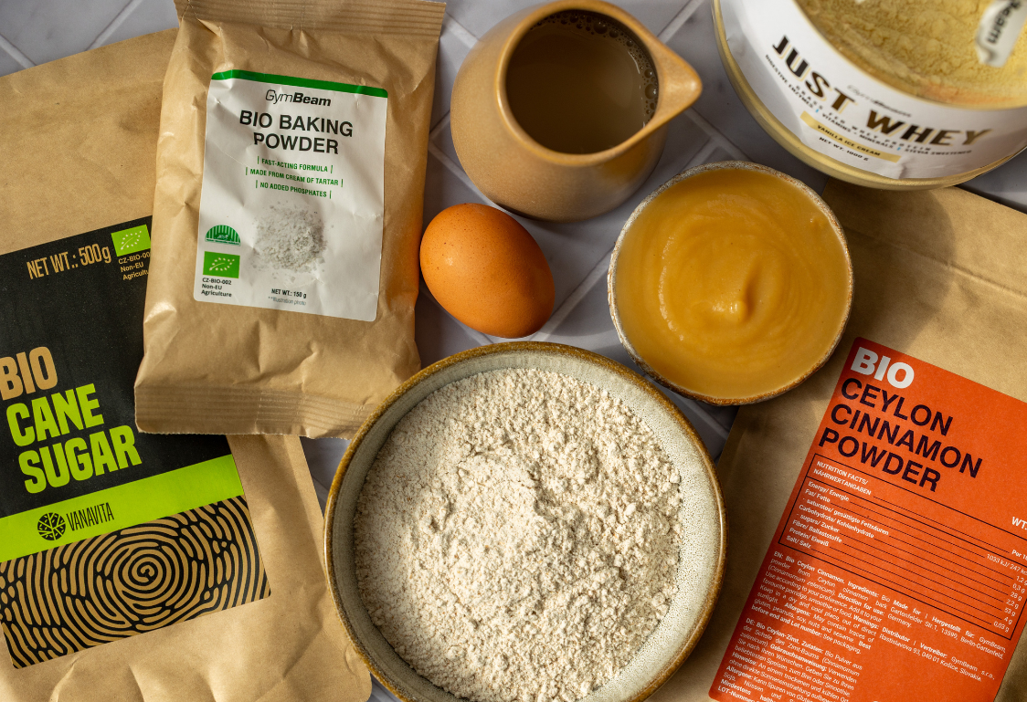 Začneme prípravou cesta. Múku premiešame s cukrom, proteínom, kypriacim práškom, zázvorom, škoricou a klinčekmi. Potom pridáme jablkové pyré, vajcia, mlieko, olej a vymiešame hladké cesto. Tým naplníme silikónové donutové formičky.