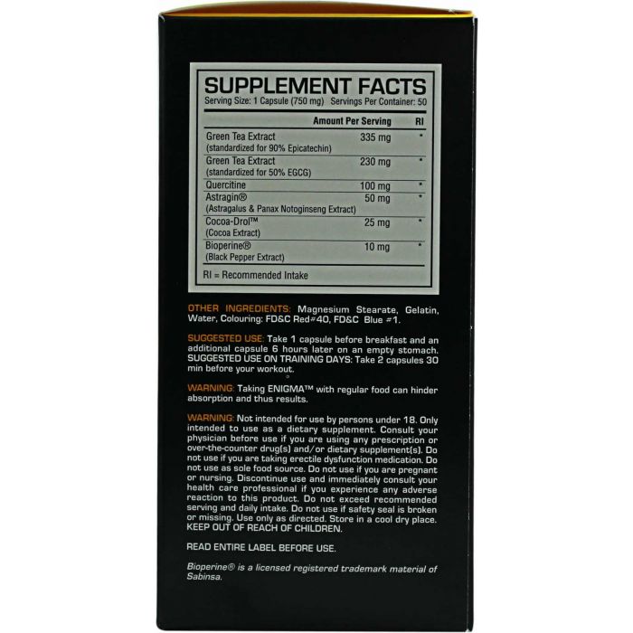 Enigma je unikátny doplnok, ktorý vám pomôže prelomiť všetky prekážky! Jedinečné zloženie ingrediencií je najlepším riešením pre všetkých fyzicky aktívnych ľudí. Je vynikajúci pre posilnenie tela a postará sa aj o výbornú prípravu na každé nasledujúce cvičenie. Posilňuje syntézu svalovej hmoty, bráni katabolizmu, zvyšuje rozvoj sily a vytrvalosti. Umožní vám dosiahnuť ešte lepšie výsledky! Extrakt zo zeleného čaju zabezpečí účinnejšiu redukciu tuku a lepšiu antioxidačnú ochranu, a ďalšie zlúčeniny prispievajú k efektívnemu vstrebávaniu živín, zlepšenej regenerácii a výrazne nižšiemu pocitu únavy.