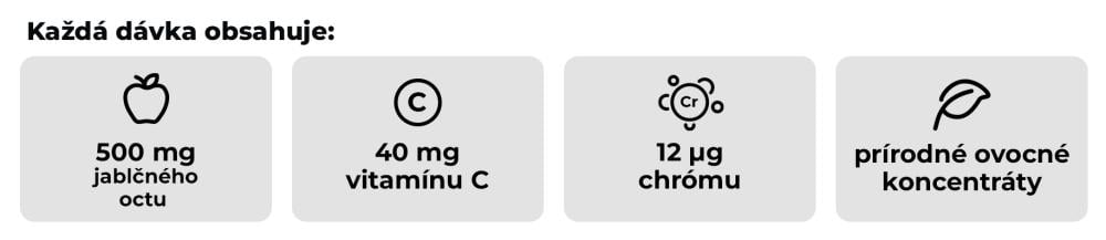 Prášok z jablčného octu, vitamín C (L‑askorbová kyselina), pikolinát chrómu, sacharóza, glukózový sirup, čistená voda, zahusťovadlo (pektín), koncentrát jablčnej šťavy, koncentrát granátovej šťavy, koncentrát čiernej ríbezle, regulátor kyslosti (citran sodný), koncentrát mrkvovej šťavy, prírodná aróma, regulátor kyslosti (kyselina citrónová), leštiace látky (kokosový olej, karnaubský vosk), koncentrát čiernej mrkvy.