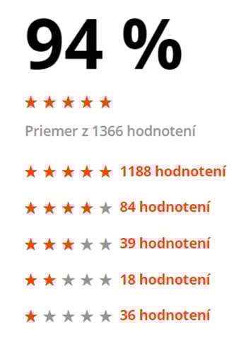Toto percento predstavuje priemerné hodnotenie kvality produktu, získané zo všetkých overených recenzií, teda od zákazníkov, ktorí nakúpili v našom e-shope daný produkt cez svoj používateľský účet.