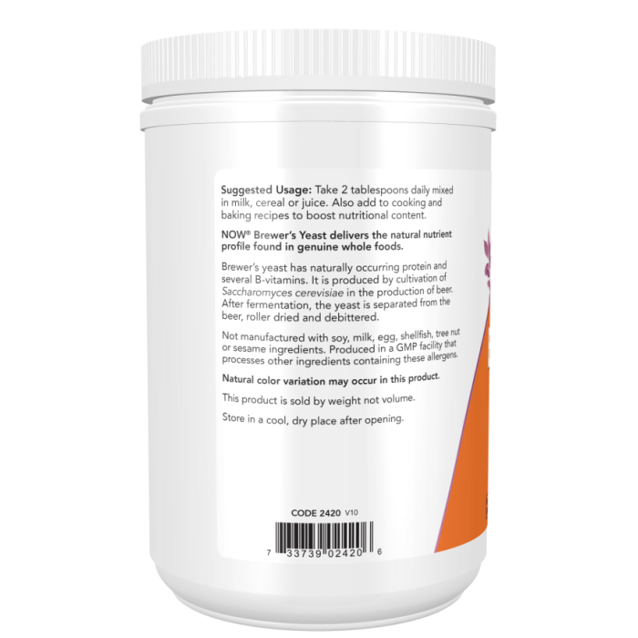 Obsahuje pšenicu. Pivovarské kvasnice sú získané z jačmeňa a pšenice. Nie sú vyrábané zo sóje, mlieka, vajec, rýb, mäkkýšov alebo stromových orechov. Vyrába sa v zariadení GMP, ktoré spracováva ďalšie zložky obsahujúce tieto alergény. V tomto produkte sa môže vyskytnúť prirodzená zmena farby. Po otvorení skladujte na chladnom a suchom mieste.