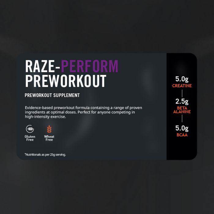 Predtréningový stimulant Raze-Perform™ obsahuje kofeín pre nabudenie a kreatín, ktorý pomáha zvýšiť výkon v priebehu krátkých tréninkových intervalov