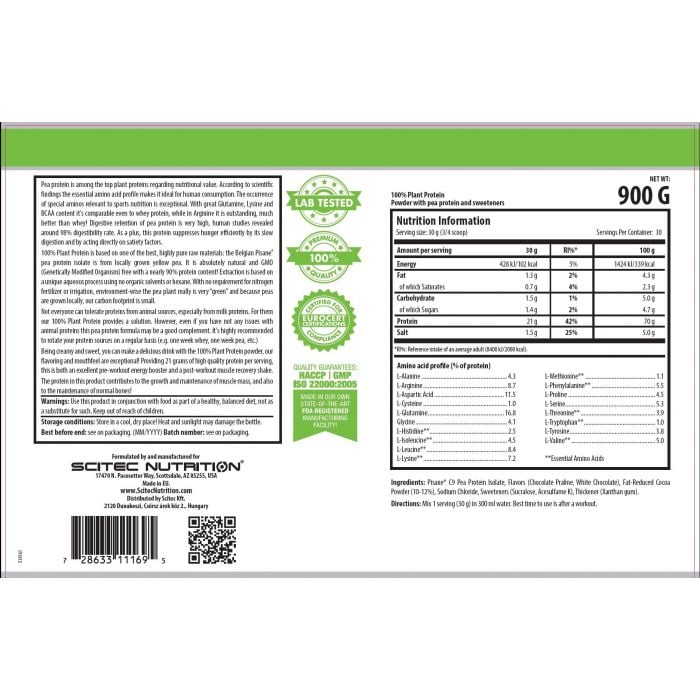 100% Plant Protein je hrachový proteínový izolát zo žltého hrachu z Belgicka, ktorý je absolútne prírodný a bez GMO. Tento proteín rastlinného pôvodu má 70%-ný podiel bielkovín, vynikajúci obsah glutamínu, lyzínu a BCAA. Naviac, účinne potláča pocit hladu, pretože sa pomaly trávi a priamo pôsobí na faktory plnosti. Chuťovo je výborný, sladký a krémový.