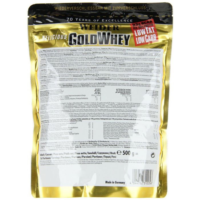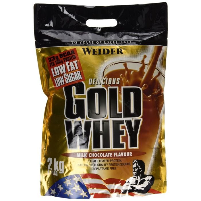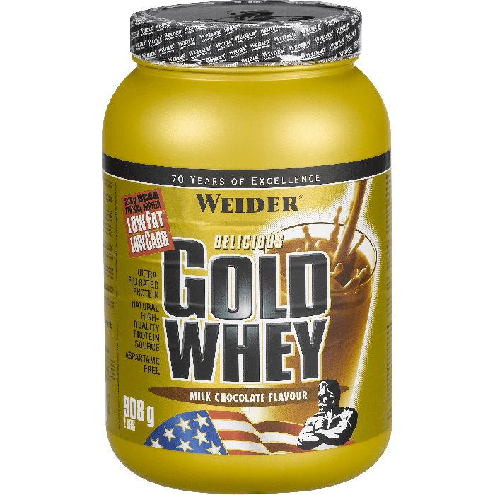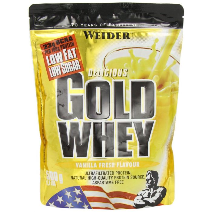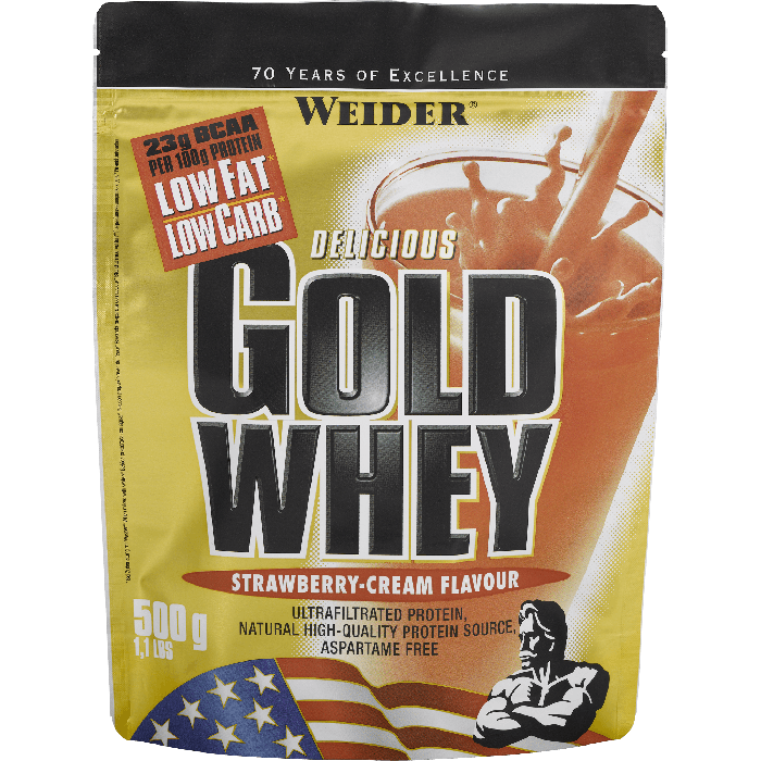 Gold Whey Protein od spoločnosti Weider je ultrafiltrovaný srvátkový proteínový koncentrát, ktorý zabezpečí vysoký obsah BCAA, a to až 23 g v 100 g proteínu. Tento 80 % proteín s minimálnym množstvom cukrov a tukov, bez obsahu aspartámu, obsahuje bioaktívne zložky, ako beta a alpha-lactoglobulíny, redukujúce kyslosť organizmu. Tie zaisťujú ľahšiu regeneráciu a adaptáciu organizmu na záťaž, a navyše imunoglobulíny posilňujú obranyschopnosť organizmu a glycomacropeptidy obmedzujú chuť k jedlu.