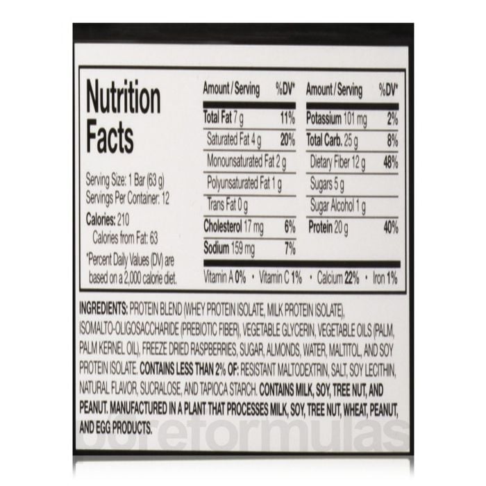 Príchuť čokoládové brownie: proteínová zmes (srvátkový proteínový izolát, mliečny proteínový izolát), isomalt-oligosacharidy (prebiotická vláknina), čokoládové kúsky (čokoládový likér (spracovaný metódou Alkali), cukor, kakaové maslo, vanilka), glycerín, rastlinný olej (palm, palm kernel olej), cukor, mandle, voda, sójový proteínový izolát, Malitol, kakao (spracované metódou alkali), menej ako 2%: soľ, sójový lecitín, prírodná aróma, sukralóza, vanilka, tapiokový škrob.
