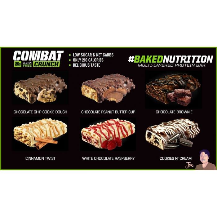 Combat Crunch je proteínová tyčinka vyrobená pomocou patentovaného procesu pečenia pre lepšiu chuť a jemnejšiu textúru. Tieto tyčinky obsahujú vysoký obsah bielkovín s aktívnymi sacharidmi a množstvom vlákniny. Combat Crunch neobsahujú žiadne lacné zdroje bielkovín, iba prvotriedne bielkoviny (srvátkový proteínový izolát a mliečny proteínový izolát), majú vysoký obsah vlákniny, naproti tomu naopak nízky obsah jednoduchých cukrov, neobsahujú žiadne trans tuky ani lepok. Ideálna desiata pre všetkých, ktorí hľadajú kvalitné proteínové tyčinky na doplnenie denného príjmu bielkovín, navyše skvele chutia.
