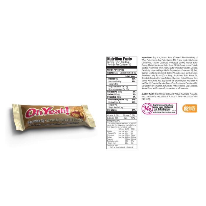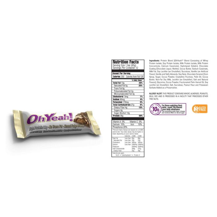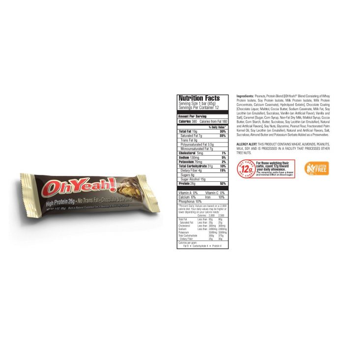 Oh Yeah je nová proteínová tyčinka, ktorá vyniká neprekonateľnou chuťou. A nie len tým! Obsahuje až 30 g kvalitných bielkovín, zdravých tukov (CLA, EFA), nízky podiel cukru a žiadne trans tuky! Je viac ako ďalšia ochutená tyčinka. Bezlepková tyčinka Oh Yeah! je vyrobená iba z tých najkvalitnejších surovín s kúskami orieškov zaliatych v karamele a mliečnej čokoláde! Je absolútne lahodná a výživná.
