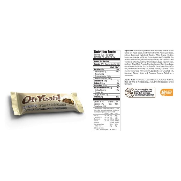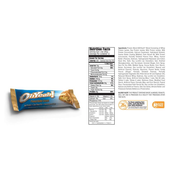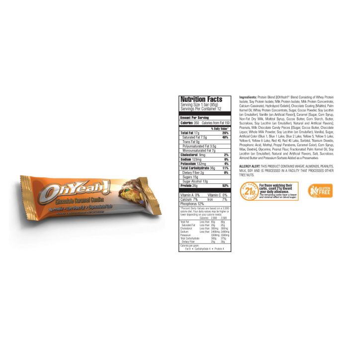 Príchuť Chocolate & Caramel: arašidy, proteínová zmes [(OhYeah! Zmes obsahujúca srvátkový proteínový izolát, sójový proteínový izolát, mliečny proteínový izolát, mliečny proteínový koncentrát, kazeinát vápenatý), hydrolyzovaná želatína], čokoládová poleva (čokoládový likér, maltitol, kakaové maslo, kazeinát sodný, mliečny tuk, emulgátor sójový lecitín, sukralóza, umelé arómy vanilín, vanilka, soľ), karamel (cukor, kukuričný sirup, odtučnené sušené mlieko, maltitolový sirup, kakaové maslo, kukuričný škrob, maslo, sukralóza, emulgátor sójový lecitín, prírodná a umelé arómy), sója, glycerín, arašidová múka, palmový olej, sójový lecitín (emulgátor), prírodná a umelé arómy, soľ, sukralóza, mandľové maslo, konzervant sorbát draselný.