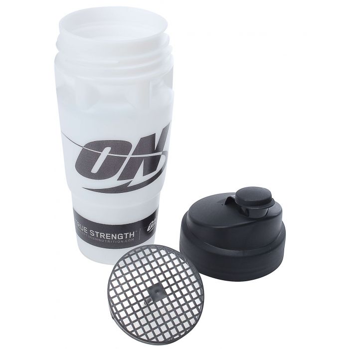 Šejker biely je klasický šejker s objemom 700 ml, závitom a sitkom vo vnútri na perfektné rozmiešavanie vašich obľúbených proteínov, predtréningových stimulantov a kreatínu. Je vyrobený z vysoko kvalitného a netoxického plastu, neobsahuje BPA a DEHP. Obsahuje logo Optimum Nutrition a stupnicu v mililitroch a unciach.