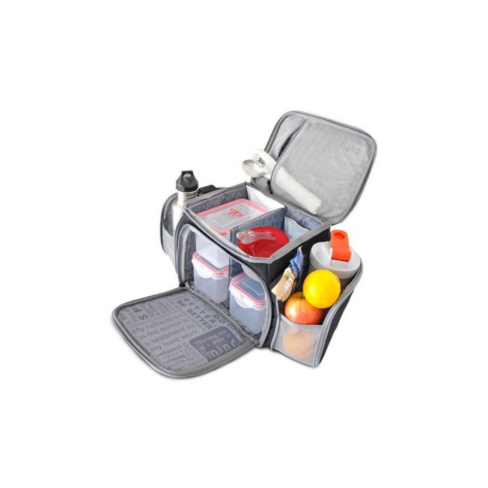 Športová taška na jedlo The Shield Steel Gray s pekným dizajom, inovatívnymi funkciami a materiálom najvyššej kvality. The Shield posúva tašky na jedlo na nový level. Je ľahká, prenosná, vyrobená z pevného polyesterového nylonu. Obsahuje polstrovaný popruh, ktorý je odnímateľný. Jednoducho si v nej zorganizujete svoje pripravené zdravé jedlo na celý deň. Obsahuje 3 veľké boxy na hlavné jedlo, 2 chladiace gély (schválené TSA), dávkovač na vitamíny, suplementy a proteínové nápoje, 2 mimoriadne inteligentné rozšírené vrecká na fľašu, proteínové tyčinky a ovocie. Vaše kľúče budú mať v taške tiež vlastný priestor. Na zadnej vonkajšej časti nájdete miesto aj pre svoj fitness diár alebo časopis. Taška The Shield vám uľahčí cestu do práce či do fitka, a navyše budete mať všetko svoje zdravé jedlo až 8 hodín čerstvé a vždy k dispozícii. Taška má objem 15,5 litra.