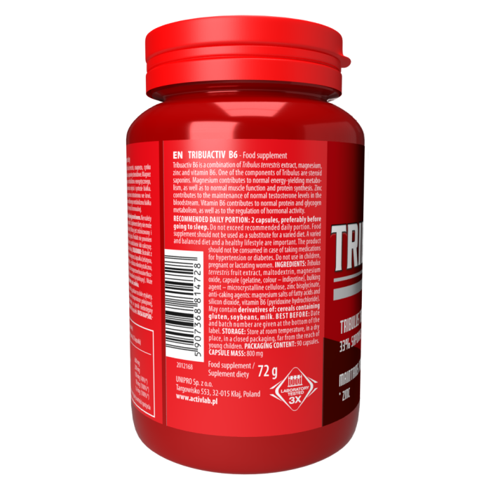 Tribuactiv B6 – kombinácia výťažku z rastliny Tribulus Terrestris, horčíka, vitamínu B6 a zinku, ktorý podporuje normálnu hladinu testosterónu v krvi