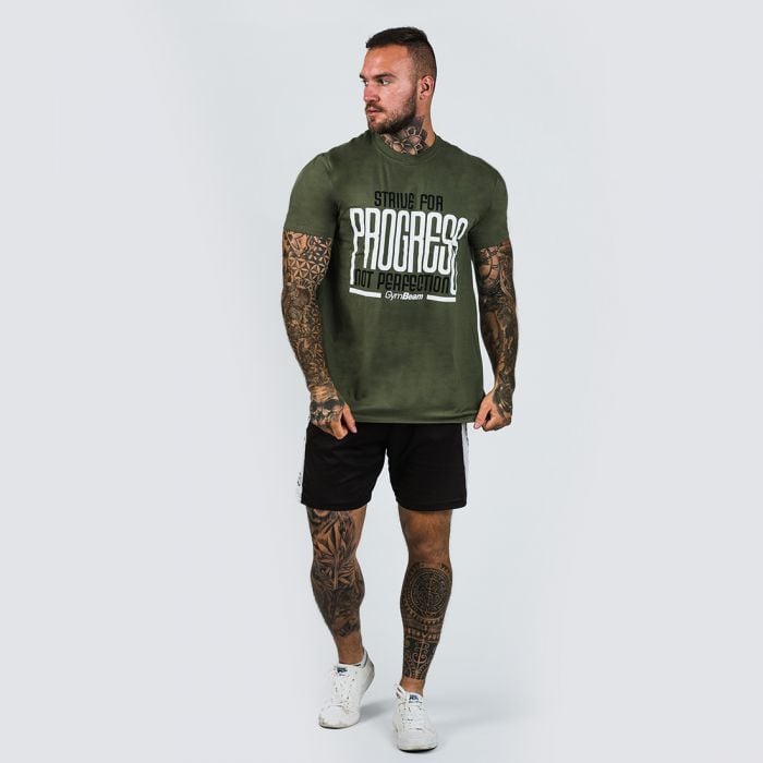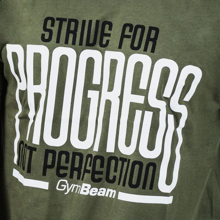 Tričko Progress Military Green by nemalo chýbať v šatníku žiadneho športovca, ktorý trénuje pre progress a nie dokonalosť. Tričko má voľnejší strih, moderný dizajn a výrazný nápis “Strive for progress, not perfection” na hrudi. Je vyrobené z bavlny, a preto ho budete radi nosiť počas bežného dňa a tiež na tréningy.